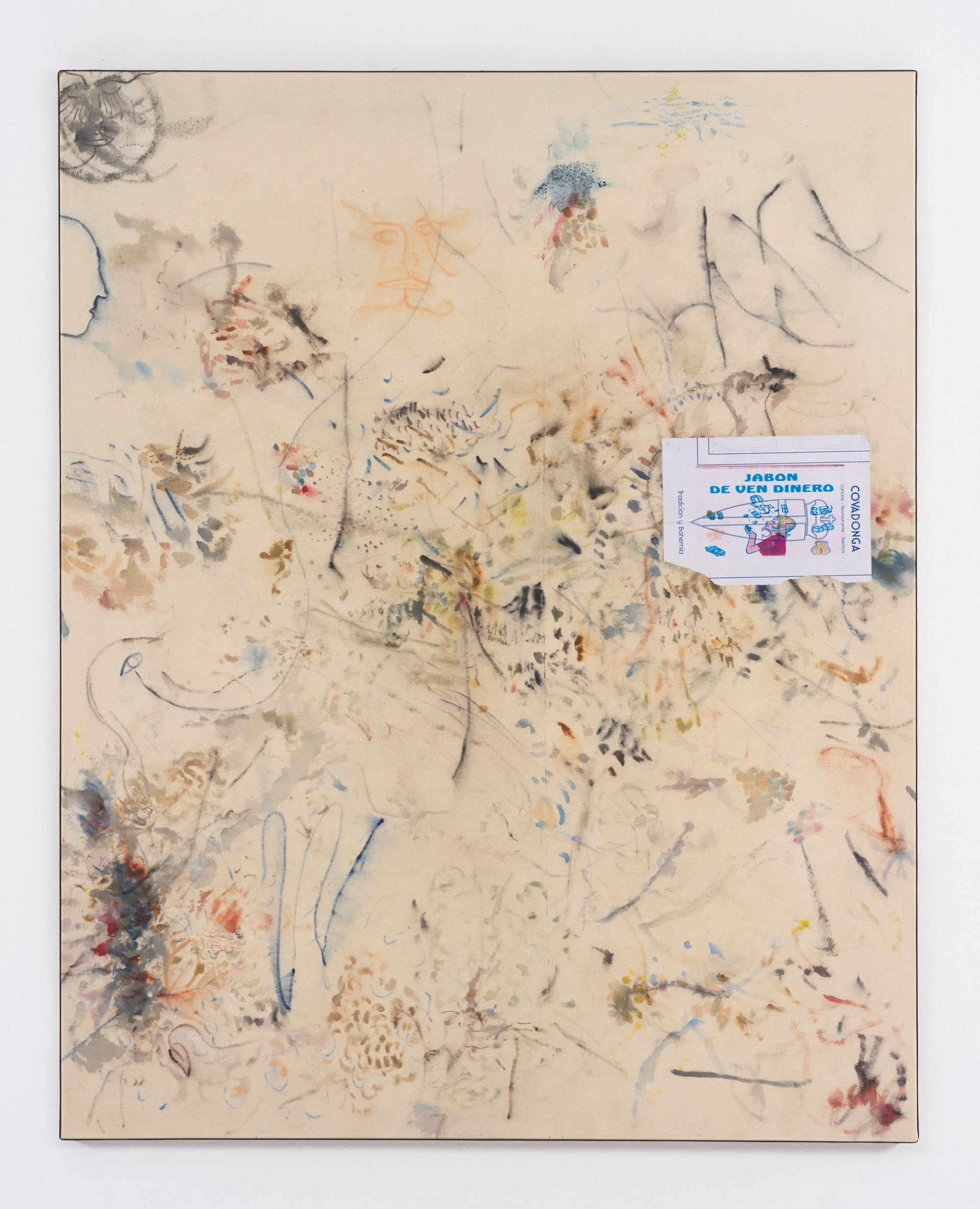 Malte Zenses, gemalt im Dschungel mit Komm-Geld-Seife & Klassenkneipe kombiniert, 2025, watercolour, paper and rabbit-skin glue on canvas, photo: Nick Ash
